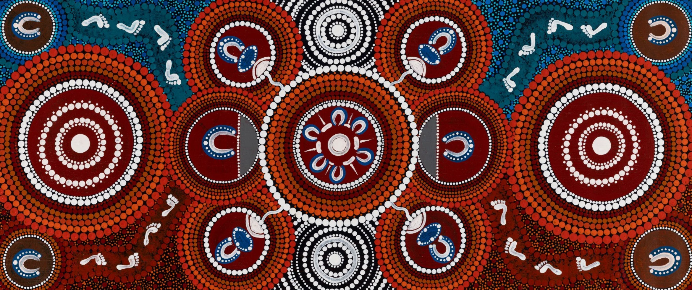 This artwork was created by Anmatjere artist Curtis Haines for NCCR. It symbolises a place to come together and talk about sepsis: the green section represents people coming from outside Central Australia, while the brown section represents bush mob. Both groups are journeying toward a central meeting point to collaborate.